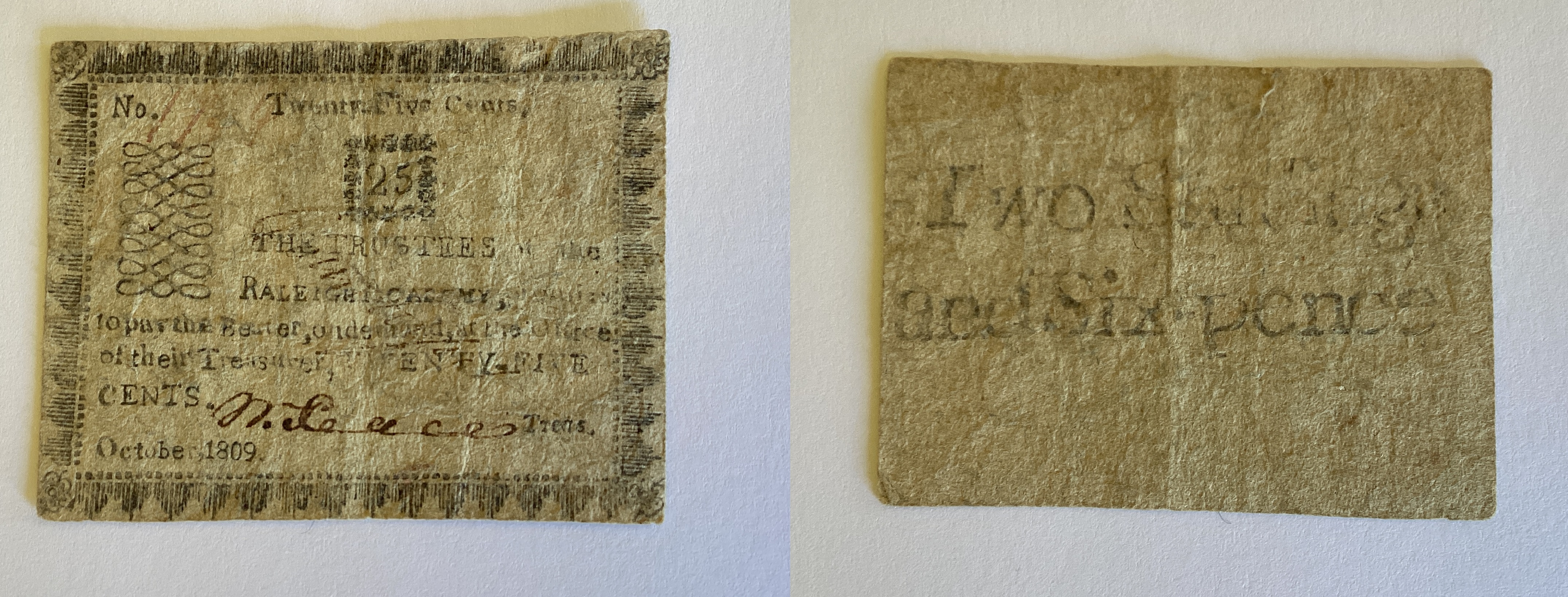 Raleigh Academy Trustees 1809 ![]() The face value is 25c on the front and 2 shillings and sixpence on the back Condition: This condition would be described as good to almostt fine. In 1809, the Trustees of Raleigh College, North Carolina, issued a rare dual currency note valued at 25 cents or two shillings and sixpence. It was issued in October 1809. The note's face value was 25c, with the equivalent amount of "two shillings and sixpence" stamped on the back. The note is described as being in good antique condition, showing normal wear but no tears or stains. Raleigh College is understood to be the Raleigh Academy, which was founded in 1801 with state support and closed in 1828 due to financial difficulties and increased competition.