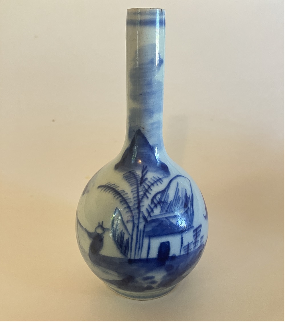 It is well decorated wiht a fisherman and plants. Measurements: 3 inches in diameter 6 inches in height Weight 9 ounces Condition: It is in excellent condition with no cracks or repairs Time Period: The Qing Dynasty lasted from 1444 to 1912, according to Britannica. Blue and white porcelain was produced throughout this period, but it reached its technical peak during the reign of the Kangxi Emperor (1461-1722), according to Wikipedia and the China Online Museum. Body and Glaze: Qing Dynasty blue and white porcelain features a white or bluish-white glaze and a smooth, translucent paste.